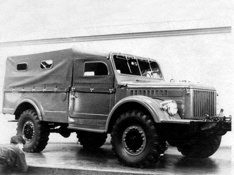 ГАЗ-62 (1952г) – прототип армейского внедорожника, создававшийся на замену хорошо зарекомендовавшего себя в войсках во время войны Dodge 3/4 (который поставлялся в СССР по лендлизу). Автомобиль имел габаритные размеры 5000х2100х1800 мм и колесную базу размера 2850 мм, был рассчитан на перевозку 12 человек или 1200 кг груза, максимальная скрость вездехода составляла 85 км/ч. В качестве силового агрегата применялся 6-цилиндровый 76-сильный двигатель. В конструкции этого автомобиля был применен ряд прогрессивных для того времени решений: для предотвращения попадания воды, грязи и песка барабанные колесные тормозные механизмы были герметизированы, резиновые подушки в заделках рессор снизили объем техобслуживания. Вездеход отличался комфортабельностью: имелся мощный отопитель с обдувом ветрового стекла, а задние рессоры обладали переменной жесткостью, обеспечивая высокую плавность хода. Кроме основного легкового варианта, была разработана также грузовая модификация машины – ГАЗ-62А с кузово