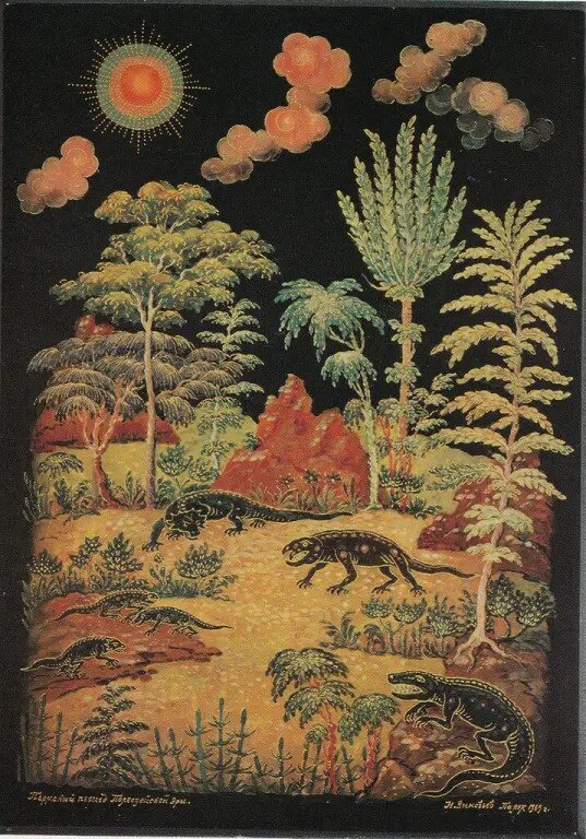 Динозавры, нарисованные в народном стиле, не фотошоп. Это советский палех, отец которого — Николай Михайлович Зиновьев, наш герой. Он родился в далёком 1888 году в небольшой деревне недалеко от Палеха, и вся его жизнь была неотрывно связана с этим местом, этим стилем и его наследием. Для маленького Николая изобразительное искусство началось с икон. Ему даже посчастливилось застать Васнецова за работой в мастерской, и мальчик ему еще долго подражал. Михаил Зиновьев, отец, был иконописцем и писал в традиционном палехском «мелочном письме».