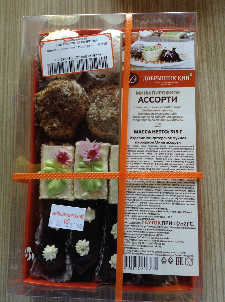 В составе: 1. Воздушное с кремом, 2. Картошка глазированная, 3. Бисквитное со сливочным кремом, 4. Профитроль со сливочным кремом. Долго к ним приглядывался, но не брал, т.к. стараюсь избегать сладкого и мучного, да и цену в 550 рублей за 345 г не назовешь демократической. Это 1600 руб за кг. Сладкий хлеб с кремом того не стоит. Однако представился случай и я решил купить к чаю. Я уже несколько раз покупал торт Москва этого производителя и остался доволен, поэтому было доверие. Тем не менее в составе есть спред и это очень смущает. Фабрика кричит об истории, традициях, вот только я очень сомневаюсь, что в советский период в эти пирожные добавляли спред вместо сливочного масла. Неужели за такую цену нельзя обойтись без спреда? А если не получается, то лучше пусть поднимут цену, но в составе пусть будут только натуральные ингредиенты и покупать все равно будут – те, кто ценит качество. Тем не менее, мне понравились мини пирожные, все 4 вида. Ставлю им твердую четверку. Выглядит все довол