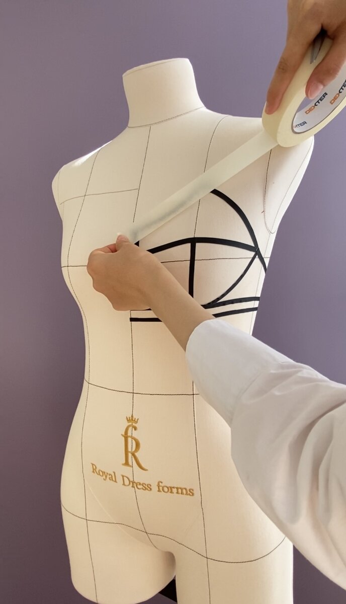 - С помощью ленты наносим контуры будущего изделия. Отмечаем все швы, рельефы, вытачки и т.д..