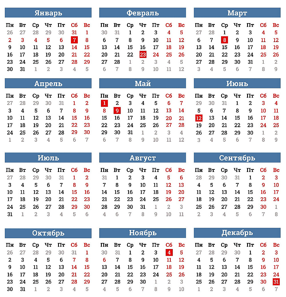 Министерство труда и социальной защиты представило рабочий календарь на следующий год. Посмотрим, сколько будет выходных и праздничных дней. Правительство РФ утвердило календарь рабочих, выходных и праздничных дней на 2023 год. Самые ожидаемые россиянами новогодние праздники продлятся в России с 31 декабря 2022-го по 8 января 2023 года включительно. С учётом того, что в 2022 году 31 декабря попадает на субботу, этот день и так будет нерабочим. Выходные с 1 и 8 января, которые придутся на воскресенье, будут перенесены на 24 февраля и 8 мая 2023 года соответственно. Благодаря переносам в России будут долгие четырёхдневные выходные с 23 по 26 февраля и с 6 по 9 мая. Также по три дня можно будет не работать с 29 апреля по 1 мая, с 10 по 12 июня и с 4 по 6 ноября. 8 марта, которое в 2023 году придется на среду, будет отдельным выходным днём.