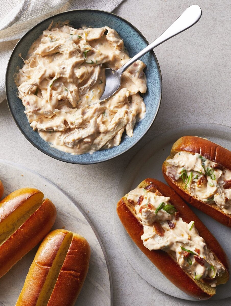 Сочетание нежной булочки и бархатистого соуса с курицей, сливочным сыром и сметаной. И все это дополнено пикантными специями и острым сыром. Приготовьте начинку для этого блюда утром, чтобы иметь возможность собрать хот-доги для своих домочадцев всего за пару минут. Время готовки: 40 минут. Ингредиенты на 8 порций: - 500г. куриных грудок. - 100мл. куриного бульона. - 100г. сливочного сыра. - 3 ст.л. сметаны. - 1/2 чайной ложки сушеной петрушки. - 1/2 чайной ложки лукового порошка - 1/2 чайной ложки чесночного порошка - 1/4 чайной ложки сушеного укропа - 1/4 чайной ложки соли - 80г. острого сыра Чеддер. - 80г. сыра Монтерей Джек. - 4 полоски обжаренного бекона (нарезать мелко). - 1 ст.л. нарезанного зеленого лука. - 8 булочек для хот-догов. Приготовление 1. Поместите курицу и куриный бульон в мультиварку или скороварку. Готовьте 15-20 минут до полной готовности на средней температуре. 2. Разомните курицу вилкой в отдельной миске. Верните ее в посуду, в кото