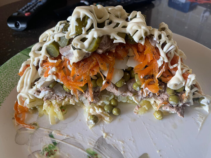 Натереть сыр. Затем на сыр выложить очень мелко нарезанный репчатый лук (а можно и зелёный). Печень трески можно размять вилкой, а можно нарезать средними кубиками. Выложить печень трески на лук. Затем - немного консервированного зеленого горошка. Выложить яйца (у меня перепелиные) нарезанные дольками, и вареную морковь. Немного посолить и снова выложить печень. Маринованные корнишоны тоже нарезать кубиками, и выложить сверху. И густо нанести майонезную сетку из домашнего майонеза. Больше общения и рецептов - в группе "Рецепты для диабетиков" в ВКонтакте! Рецепт на странице Автор рецепта – Seva Seva H-va