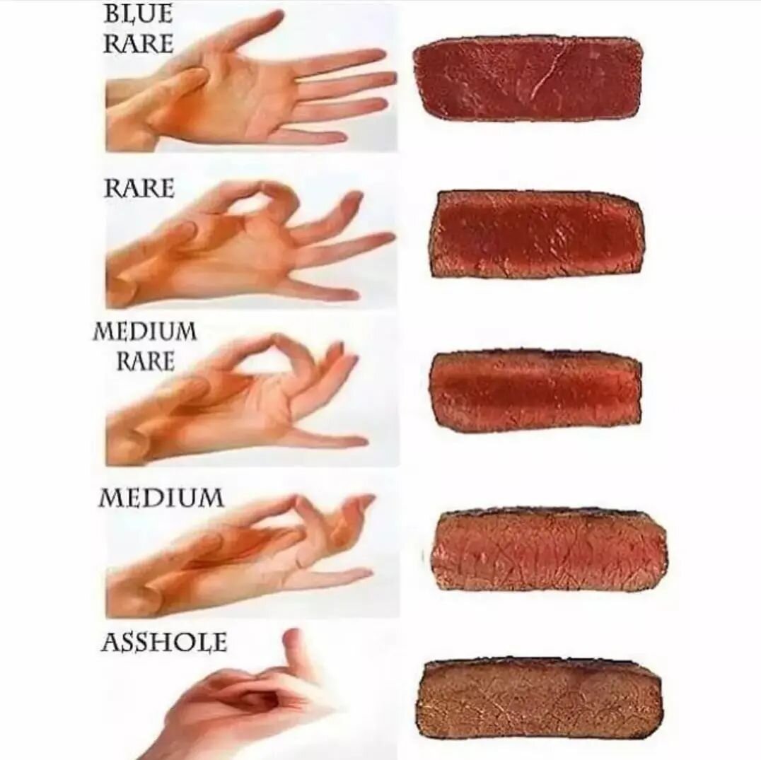 - Многие определяют степень прожарки надавливанием пальца на мясо и по ощущениям определяют к какой степени прожарки оно относится.
