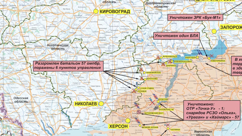 Отмечается, что российские войска разгромили в районе населённого пункта Сухой Ставок (Херсонская область) батальон 57-й мотопехотной бригады украинских войск.