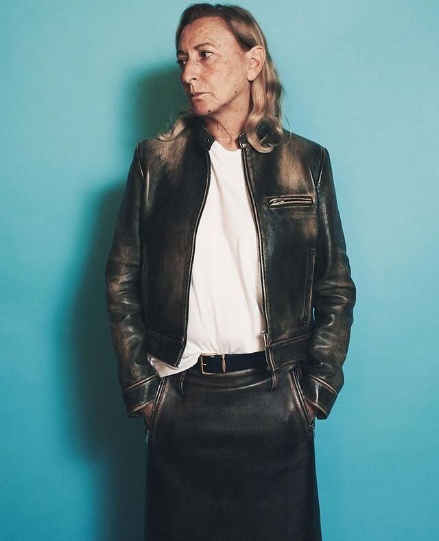 Давайте посмотрим, куда спрятались тут 73 года Миуччи Прада. Стилистом у нее была Кэти Гранд, а уж кто-то, а она умеет. Для начала - естественные волосы, естественного цвета и естественной укладки. Укладка тут была, вне всяких сомнений, но видите - никаких локонов, сложных причесок, ничего такого тут нет. Ибо естественность - главный тренд нашего времени. То же касается и макияжа. Мы его практически не видим, настолько он естественный. Она как будто вовсе не накрашена, хотя макияж есть абсолютно точно. То есть, принцип “как будто так и проснулась” - актуален не только для молодых красавиц, но и для “богатых старушек”. Хотя мы знаем, насколько сложно он достижим, если тебе не 17 лет. Ну, и любимое - одежда. Тоже простая вообще-то. Куртка из плотной, потертой кожи и кожаная прямая юбка. Плотная кожа хороша тем, что отличн