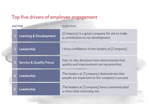 Эти первые пять вопросов представляют собой то, что мы называем «индексом вовлеченности». Мы считаем, что для понимания вовлеченности сотрудников требуется более одного вопроса. Наш индекс объединяет вопросы, посвященные ключевым результатам вовлеченности сотрудников.