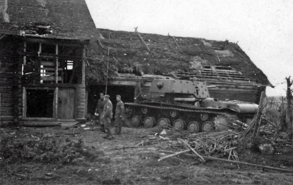 В деревне КВ наткнулся на расчет 37-мм пушки, которая была замаскирована возле крайнего дома. Немцы открыли огонь в упор, но не нанесли вреда советскому танку. Экипаж обнаружил врага и раздавил немецкое орудие. Но гитлеровцы были к этому готовы. Когда КВ развернулся для тарана, он подставил корму под удар второй спрятанной пушки - пятидесятимиллиметровой.