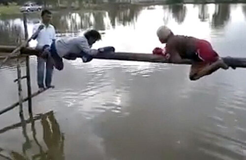 Парочка пенсионерок пришла к необычному решению, как можно урегулировать свои разногласия — надев боксёрские перчатки, бабушки вступили в схватку на бревне, перекинутом через озеро. Две жительницы небольшой деревеньки в провинции Удон-Тхани (Таиланд) годами придирались друг к другу по малейшему поводу. В конце концов соседи и друзья старушек, уставшие от этой бесконечной грызни, уговорили их устроить шутливую дуэль, чтобы раз и навсегда выяснить отношения. Десятки сельчан собрались возле озера, чтобы посмотреть, как пенсионерки в боксёрских перчатках будут балансировать над водой, тузя друг дружку. Одна из соперниц очень быстро потеряла равновесие и повисла в весьма неудобном положении. Несмотря на то, что бабушка не собиралась сдаваться, в итоге она всё-таки окунулась в грязную воду, так что вторая участница драки была провозглашена победительницей. Тарапорн Парат, один из зрителей дуэли, который снял всё происходящее на видео, рассказал, что на самом деле женщины — закадычные подруги