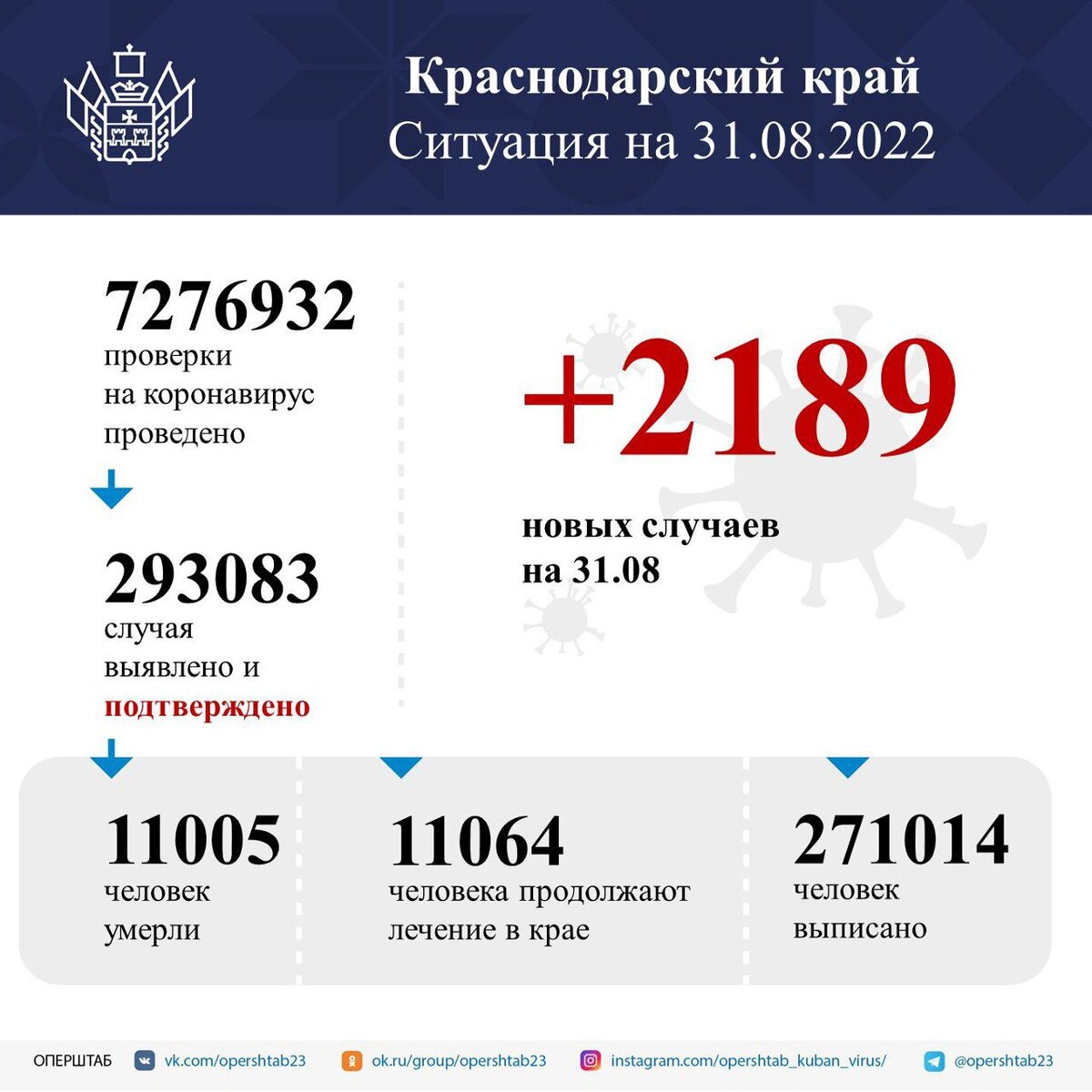 По 20 положительных результатов в Анапе и Тимашевском районе, 18 – в Темрюкском, 17 – в Приморско-Ахтарском, по 16 – в Калининском и Лабинском, 15 – в Курганинском, 14 – в Тбилисском, по 13 – в Брюховецком и Славянском, 12 – в Белоглинском, 11 – в Абинском. По 10 новых пациентов в Отрадненском и Новопокровском, по 9 – в Мостовском и Кущевском, 8 – в Щербиновском, по 6 – в Каневском и Новокубанском, по 3 – в Крыловском и Успенском, 2 – в Ленинградском