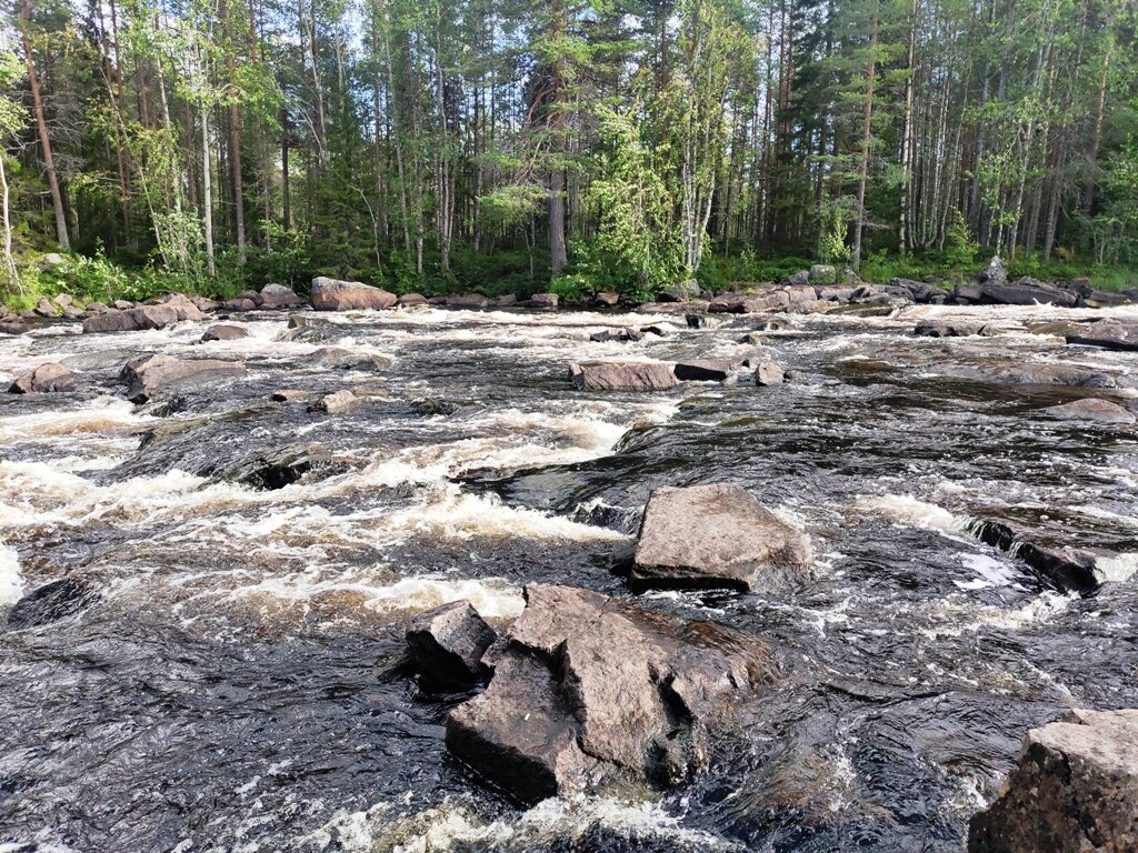 Хочу немножко уточнить: впечатления эти исключительно мои, я совсем не профессионал-каякер, и меня спасает только то, что иду на Каньоне, т.е. на такой лодке, которая позволяет очень многое. Но мне всё равно на порогах страшновато, особенно на тех, которые в описании относят к 3 категории. Хоть Воньга и простая речка, но они на ней тоже есть). К счастью, пороги на Воньге начинаются с несложных, в них просто много камней и довольно большие валы. Это то, что на каньоне проходится легко и просто. И даже если ты наедешь на камень, перебираясь по байдарке то на корму, то на нос, можно легко сняться, течение не очень сильное. Так что всевозможные пороги, которые в лоции называются разными названиями, иногда противоречащими друг другу: Прямой, Кривой, Горбатый, Кошка, Сюрприз, были просто приятным развлечением. Впрочем, это я сейчас так пишу, а перед каждым порогом было немножко не по себе) Прохождение порогов чередовалось с озёрами, на которых был очень сильный ветер, и, конечно, я уставала,