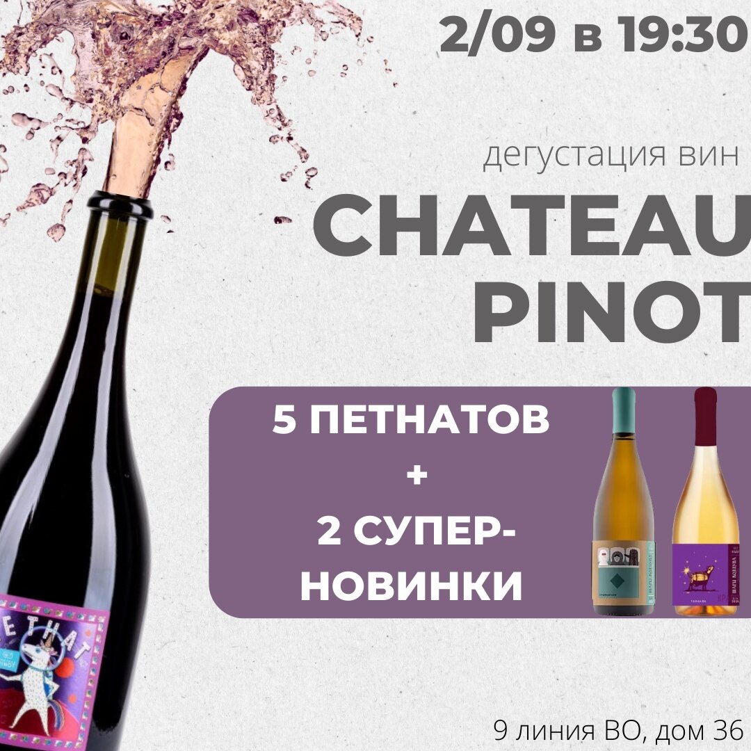 #Виноскоп_события_сентябрь_2022 #Виноскоп_дегустации После сумасшедших премьер Первых "Шаров Колдуна" и ДИЧИ амбициозная команда новороссийского хозяйства "Шато Пино", взяла небольшую паузу, но этим летом все-таки не выдержала и продолжила будоражить российских винолюбов. И вот мы в Петербурге дождались и готовы презентовать новые огненные позиции из знаменитой линейки ШАРЫ КОЛДУНА - ТОПОЛЕК И ТРОЙНИЧОК, причем в обрамлении новеньких ПетНатов-Единорогов 2021 года! В пятницу, 2 сентября, в 19.30 пройдет дегустация следующих вин: 🍾ПетНат Совиньон Блан 2021 🍾ПетНат Пино Гри 2021 🍾ПетНат Рислинг 2021 🍾ПетНат Пино Нуар 2021 🍾ПетНат Мерло 2021 🍾Шары Колдуна. Тополек 2021 🍾Шары Колдуна. Тройничок 2021 Тополек - это 100% Ркацители, выдержанный в нескольких различных бочках. Тройничок - «Тройничок» — это союз стали, бетона и дуба. В составе вина два сорта винограда в соотношении: Рислинг -70% и Русан 30%. Ферментация Русана проходила в необработанной бетонной емкости. После оконча