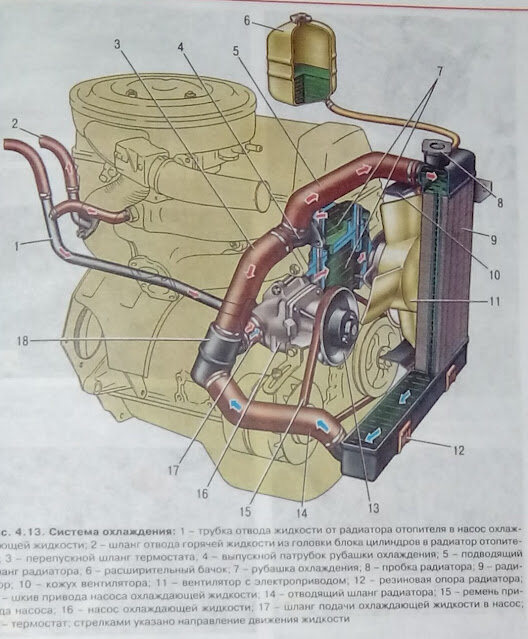 Открываем краник отопителя салона, заводим автомобиль, прогреваем его до температуры срабатывания вентилятора, выгоняем воздух из системы, проминая шланги. По ходу дела, проверяем все соединения на течь и доливаем жидкость до необходимого уровня - в систему вмещается около 8,5 л без учета расширительного бачка.