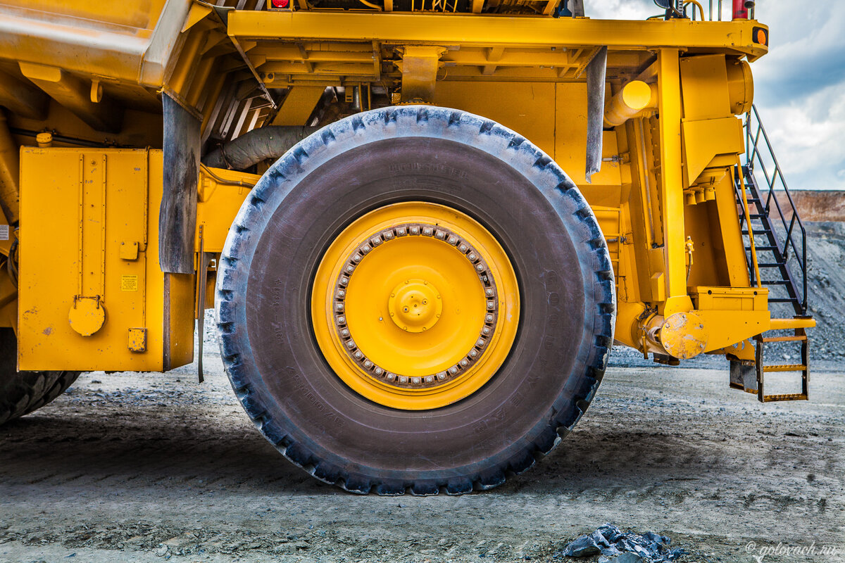 Давление в таких больших шинах – величина собирательная, оно зависит от температуры окружающей среды. Перед каждым выездом на смену и порой даже во время работы водитель контролирует его, при необходимости проводится подкачка штатным ресивером. Поскольку техника не выезжает на дороги общего пользования и постоянно передвигается по бездорожью, важно следить за покрышками.
