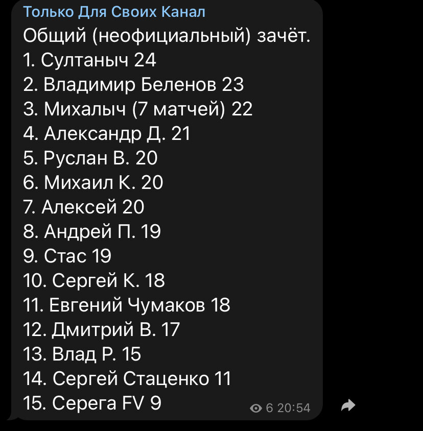 Первое место Султаныч, он занял первое место и в общем и в официальном зачете, предсказав 7исходов из 8! Набрав 24 балла. При этом Султаныч не угадал ни одного точного счёта, а занял первое место только за счёт предсказанных исходов.