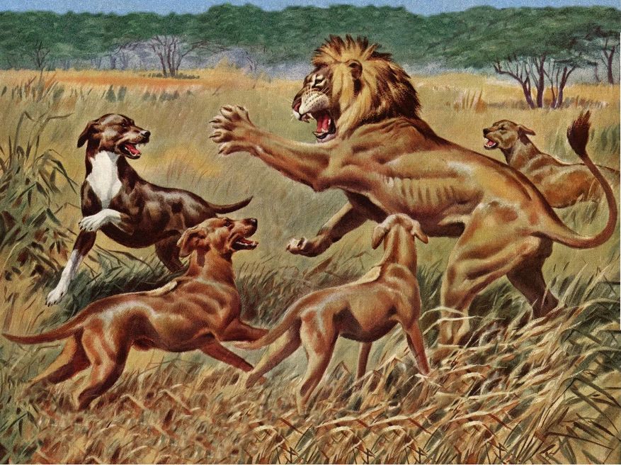 Туземцы охотятся на льва со сворой маленьких собачек.