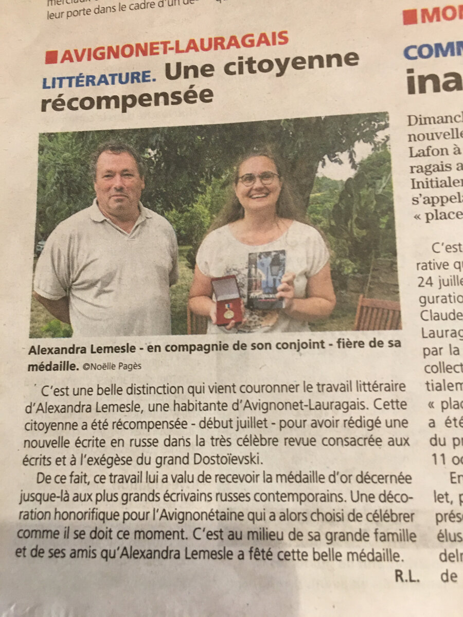 Не в целях похвастаться, а исключительно для подтверждения моих слов об отсутствии предвзятого отношения у французов к русским людям привожу вам статью обо мне с супругом в свежем номере Voir du Midi - региональной газете, которая охватывает Юг Франции от Средиземного Моря до Атлантики. Журналист, Ноэль Пажес, по совметительству супруга драматурга и бывшего мэра нашей деревни, рассказывает, что наша деревня очень рада, что на их земле живет настоящий русский соверемный писатель, не потерявшая связь с Родиной и даже получившей медаль Достоевского. Важно то, что это происходит не в самый простой для мировой истории момент, что для моих французских соотечественников рассматривается как доблесть.