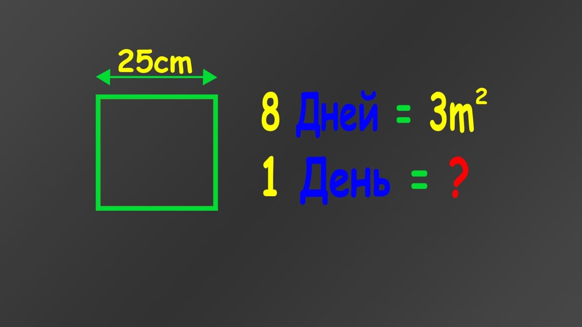 Плиточник кладет квадратную плитку со сторонами 25 сантиметров. За 8 дней он выложил 3 квадратных метра. Сколько плиток он использовал за один день? Приступим к решению! На самом деле задачу можно решить многими способами, Я представлю один логический и один арифметический способ. Начнём с логики. Можно представить как выкладывается плитка и присоединяя одну плитку к другой посчитать, что 4 плитки составят 0,25 квадратного метра, а для целого метра уже потребуются все 16 плиток. Представляйте квадратные метры как поле квадратов. Один квадратный метр это квадратное поле у которого стороны поделены на 4 (1/0,25 размер плитки). Таким образом 4х4 даёт нам 16. Всего же было 3 квадратных метра. 3х16=48 плиток было использованно за 8 дней. Теперь осталось 48 (вся плитка) поделить на 8 (количество дней), что составит 6 и что является ответом на нашу задачу. Второй вариант решения 1м^2 = 10000см^2 (кто не верит - посмотрите в таблице или просто загуглите) Данная нам площадь составляет 3 квадр