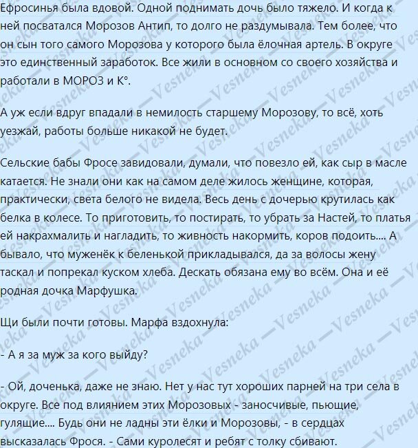 - Небось к деду Морозу пошла, - вздохнула Ефросинья, мать Марфы. - Говорят он ей жениха присмотрел. Кого-то из своих партнёров.