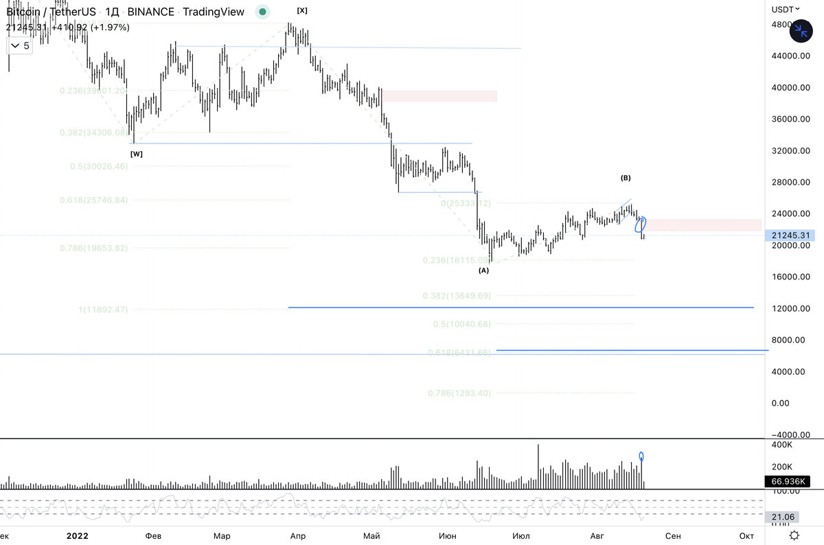 Последний план четко подтвердили последние движения, формат тройного зигзага оказался верным. Ожидаю продолжение снижения и есть две потенциальные цели: 13000+- или 7000+-. Возможен тест вчерашних продаж и вновь распродажа.
