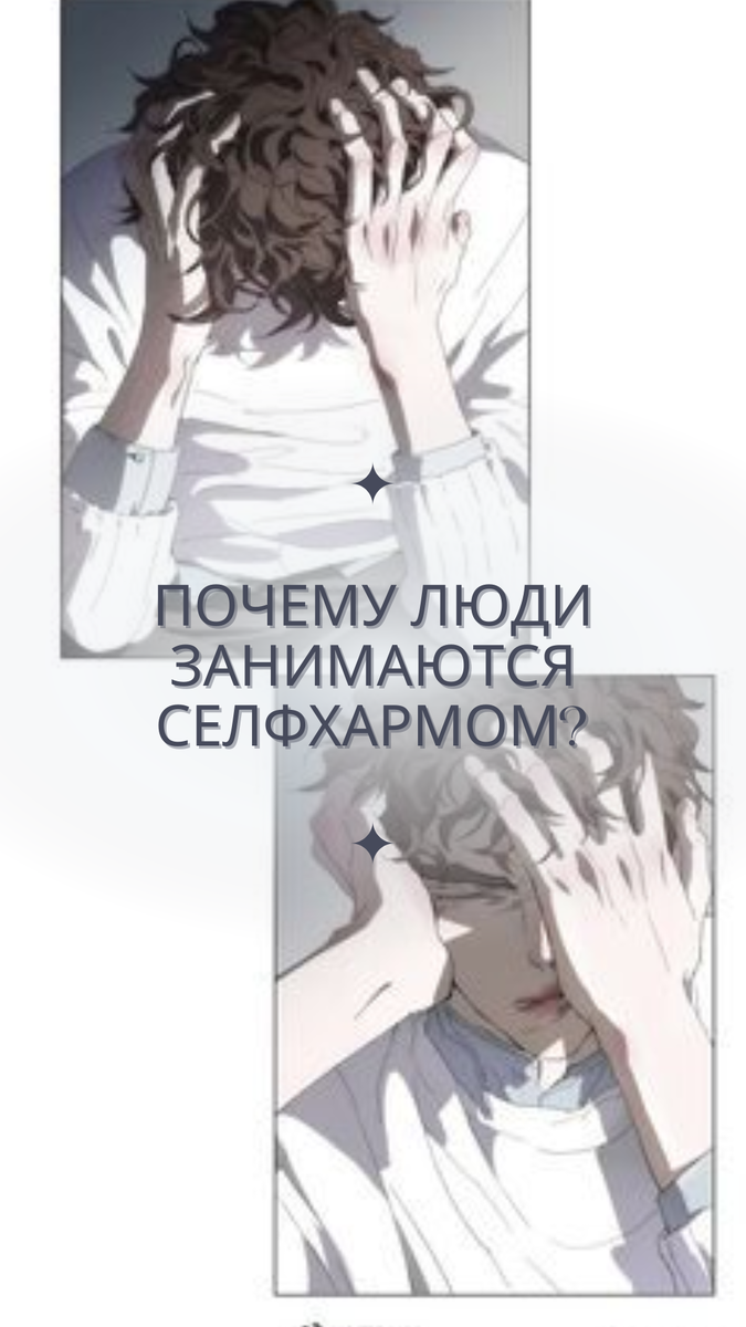 Селфхарм - когда кто-то намеренно причиняет себе вред. Если кто-то из ваших знакомых причиняет себе вред, вам может быть трудно понять, почему они это делают. Узнав больше о самоповреждении и причинах, по которым кто-то может причинить себе вред, вы сможете помочь ему или ей. Зачем кому-то заниматься самоповреждением? Когда кто–то причиняет себе вред, это признак того, что он переживает трудные времена - он может бороться с проблемами психического здоровья, чувствовать заполненность эмоциями или иметь большой стресс. Нет ни одной причины, по которой человек может нанести себе вред, но какова бы ни была его причина, она часто возвращается к эмоциональной боли. Некоторые люди часто причиняют себе вред и им трудно остановиться, в то время как другие могут сознательно навредить себе пару раз и больше не будут этого делать. Такое поведение может быть компульсивным, а это значит, что его трудно контролировать. Как только возникает такое желание, многим людям трудно ему сопротивляться. Главно