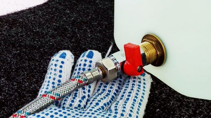 Кран который прикреплен к гибкому шлангу, потом накрутить на фитинг.