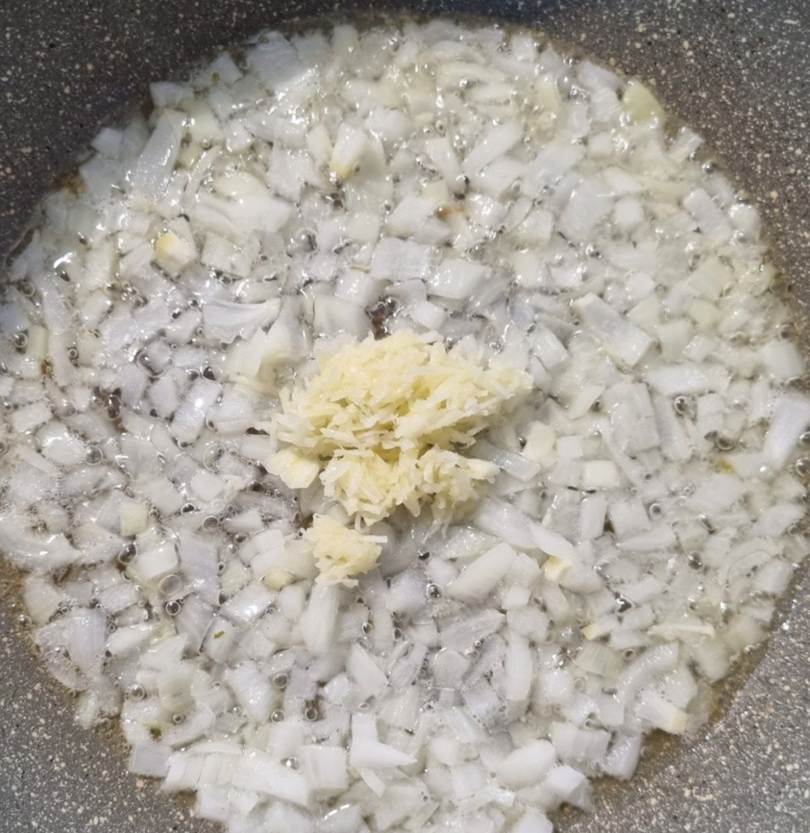 Жарим кубики лука до прозрачности, затем добавляем измельченный чеснок, жарим пару минут до появления характерного запаха чеснока.