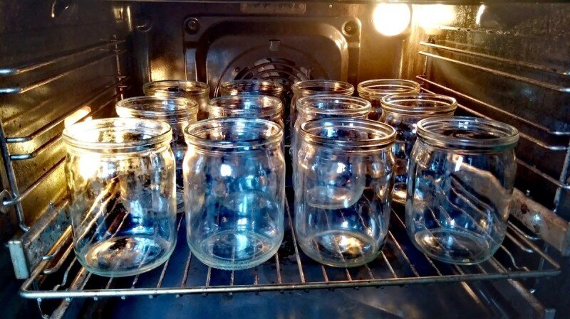 Вымытые банки ставим в холодную духовку на решетку. Если они еще влажные — вверх горлышком, а сухие — перевернутыми. Духовку включаем сначала на медленный огонь, потом прогреваем до 120–150 градусов. Литровые банки стерилизуются 15 минут, трехлитровые — 25.