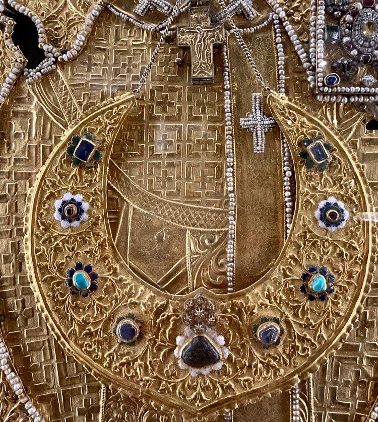 «... Манисто золото леска, да три цаты с яхонты и з жемчужинами и с плохим каменьем; да чело кичное золото с яхонты и з жемчуги, и з жемчужинами и з плохим каменьем; да три переперы кичные серебряны золочоны с яхонты и с плохим каменьем; да ожерелье на цках на золотых, розрушано с яхонты и з жемчуги и с плохим каменьем в трехнатцати жеребьех и с приделными жеребьи; да ожерелейцо сажоно жемчугомъ гурмыским и новогородскимъ, да серги болшие яхонты сини з зерны з гурмыскими, а другие серги тройни яхонтцы сини и лалцы з зерны з гурмыскими и с новогородцкими, а третьи серешки лалцы з зерны с новогородцкими; да дватцать и три жиковины женскихъ золоты с яхонтцы и с лалцы и с изумруты и з жемчушки и с плохим каменейцом; да манисто со кресты и иконы и прониски, да восмь яхонтовъ, да дватцать и два зерна гурмыских колточных; да одиннатцать запонок с переперы с яхонты и с лалы и з жемчугом и с плохим каменьем; да два чичака золоты, один грановит, а на обеих яхонты сини, да зерна гурмыские; да круживо с рукава шубы руские, сажено жемчугом гурмыским; да жемчугу полчетверты гривенки без семи золотниковъ, да восмь зерен новогородцких; да две чепи золоты, одна врана, а другая огнивчата с колотками; да пояс золот на вертлизех резан с чернью, да маялники с яхонты и з жемчуги, да с ожерелья с мусково зерен гурмыских сто и девяносто и два зерна».