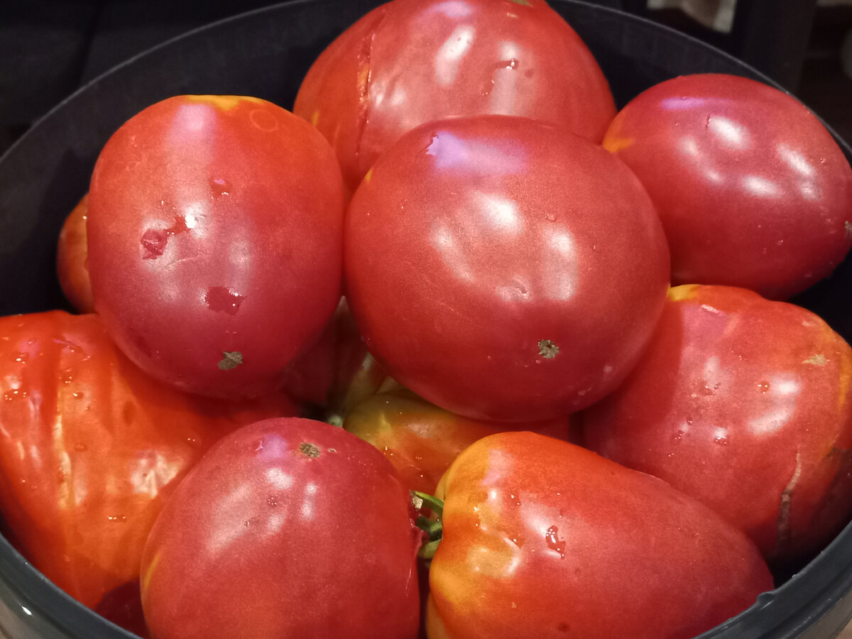 Точного веса ингредиентов в этом рецепте нет, заготавливаю на зиму его уже давно и всё делаю "на глазок". Беру по ведру помидоров и сладкого перца. Помидоры лучше использовать крупные, мясистые, но если таких нет, то подойдут и другие. Из помидоров приготовим густой томатный сок. Порежим их на куски, сложим в казан и распарим, доведя до кипения. Откинем их на дуршлаг, дадим стечь основной жидкости, остальное протрём - получится густой томатный сок. Сладкие перцы, лучше разноцветные, помоем и обсушим: Затем почистим: Нарежем соломкой: И отправим вариться в томатном соке в течение часа после закипания. За 10 минут до готовности добавим соль и сахарный песок из расчёта 1 ст. ложка соли и 3 столовых ложек сахарного песка на литр лечо. О его объёме на выходе как раз будет легко догадаться в конце приготовления. За пять минут до готовности добавляем 3-4 лавровых листа, 10 горошин душистого перца, а также по вкусу измельчённый чеснок. Уксус в этом рецепте не используется, густой томатный сок