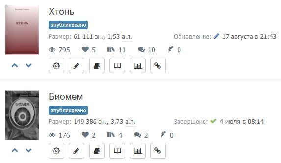 у меня началась писательская горячка - в июле закончил "биомем", сейчас пишу "хтонь". что могу сказать. "биомем" - прекрасная книга с динамичным сюжетом, несколькими слоями и множеством смыслов. она вычитана и отредактирована, у нее даже есть отличная обложка. но главное - она закончена. и поэтому могу сказать - получилось! "хтонь" - книга "в процессе", пишу очередную главу и сразу выкладываю. естественно, ни о какой редакции речи нет; обложку я сделал за 5 минут на коленке. по объему "хтонь" пока не дотянула и до половины "биомема". но главное - она не закончена. то есть вообще не понятно, получится ли в итоге что-то путное. очевидно, что "биомем" кроет "хтонь" по всем параметрам. но! "биомем" я выложил "одним куском", а "хтонь" выкладываю по главам. статистика говорит сама за себя