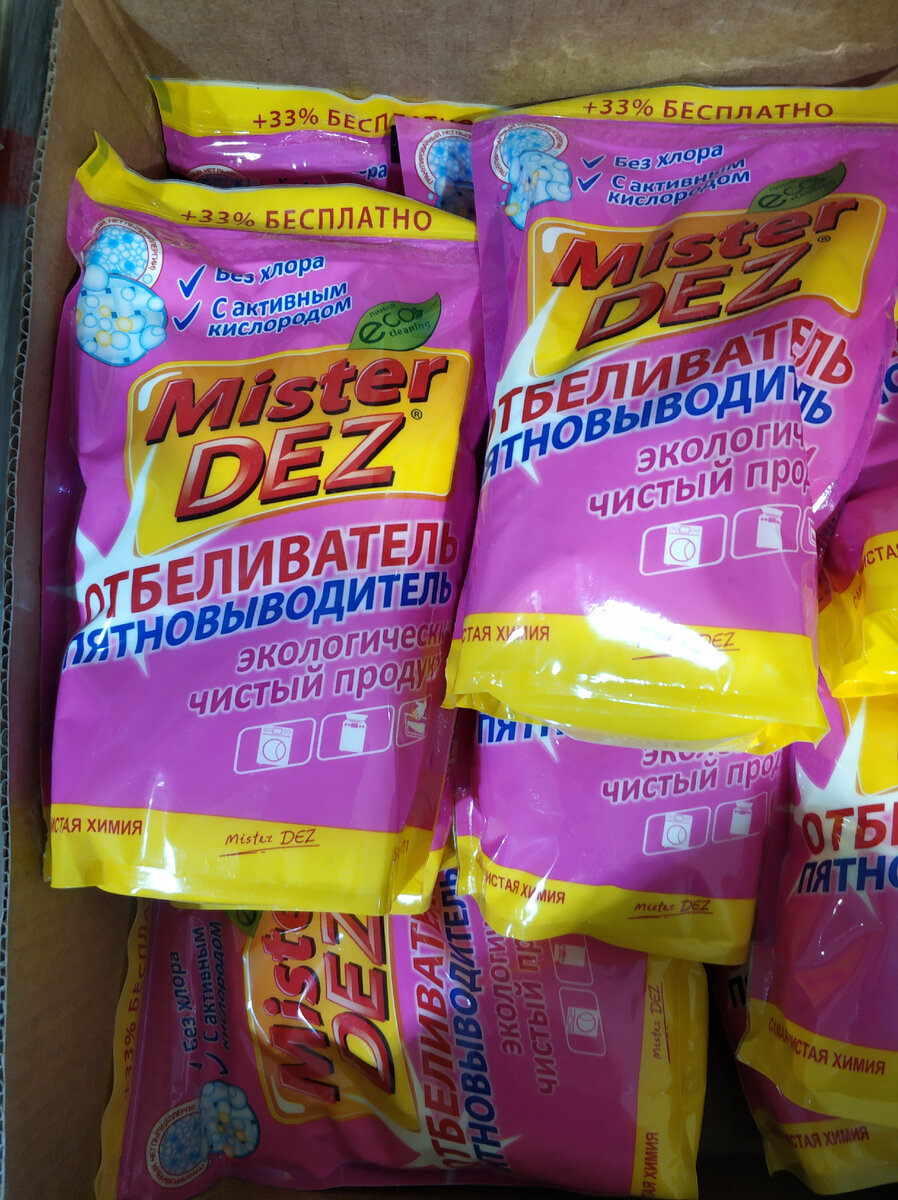Начну со средств, наверное. Вот Мистер Дез нашла, отбеливатель-пятновыводить. Очень похож на упаковку ВАНИШа. Я вот что-то уже не припомню, Ваниш остался в России, или тоже прекратив свое существование и новый владелец переименовал?