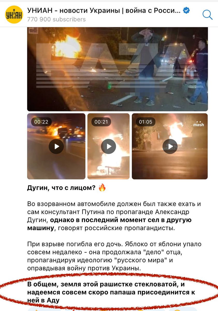 В Подмосковье взорвали автомобиль дочери Александра Дугина. Его дочь скончалась на месте. Как сообщает Владлен Татарский, в автомобиле было установлено взрывное устройство с 400г. тротила. Скорее всего, украинские террористы хотели взорвать именно Дарью, так как воевать с детьми - это любимое их занятие. Дугина выступала как активный политолог и журналист, ей было 30 лет. Что это нам говорит?