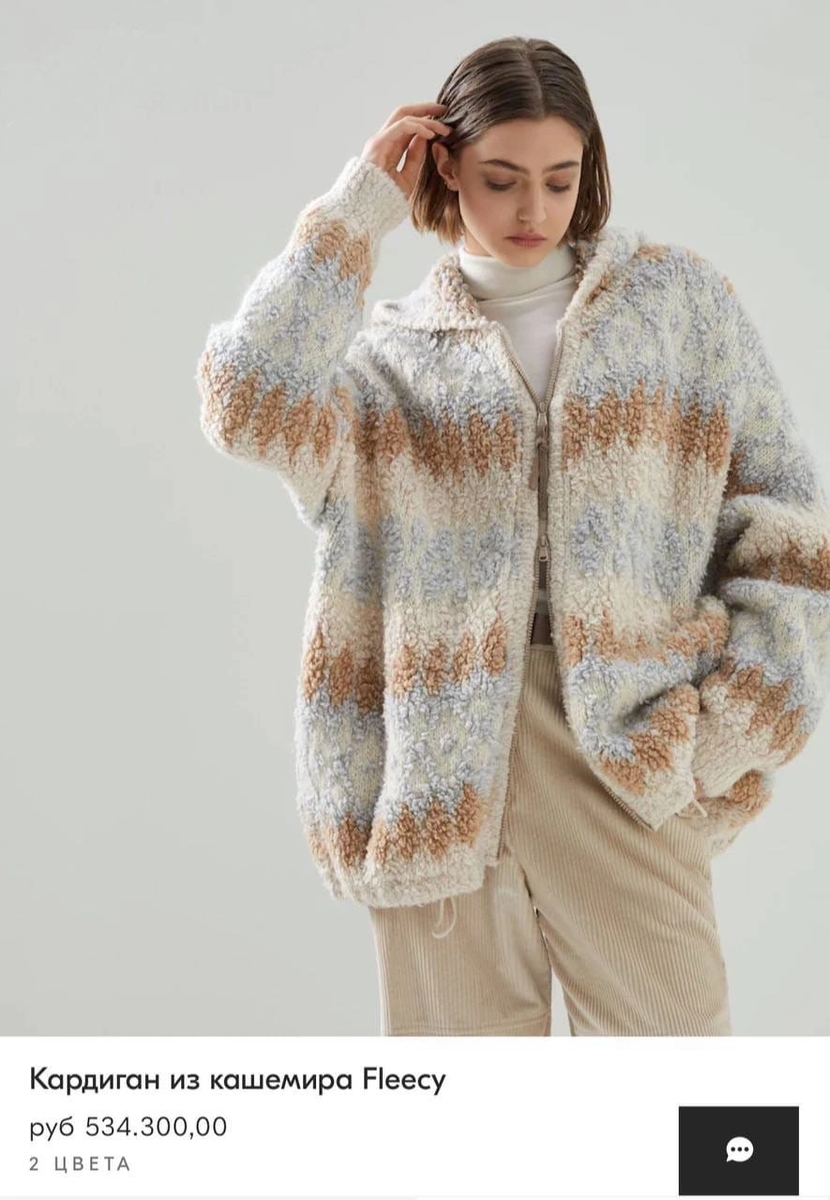 Да-да! Вы не ошиблись. Именно такие цены у одного известного бренда. Буклированная пряжа является одним из видов фасонной пряжи, с помощью которой можно создавать полотно с достаточно интересной фактурой. Нити такой пряжи имеют некоторые декоративные неровности в виде небольших петелек, благодаря чему изделия получаются объемными и мягкими. Грубо говоря, это мех "барашек". Пальто я связала как раз из буклированной пряжи. И мне стало интересно, есть ли что-то похожее у брендов. Например, Brunello Сocinelli. Итак, давайте вместе и посмотрим, что они нам предлагают. Такого плана кардиганы раньше были модны в 90-е. Я помню, у мамы был такой. Но мода возвращается каждые 20-30 лет. Думаю, пришло время таким забавным и теплым вещичкам. Вот такой интересный кардиган, как халат. Прям как у меня. Только я потратила на пряжу около 3 000 рублей и длина до щиколоток. Еще нашла такой вариант в сеточку. Модельки мне понравились, правда будет сильно продувать. То есть можно носить только теплой