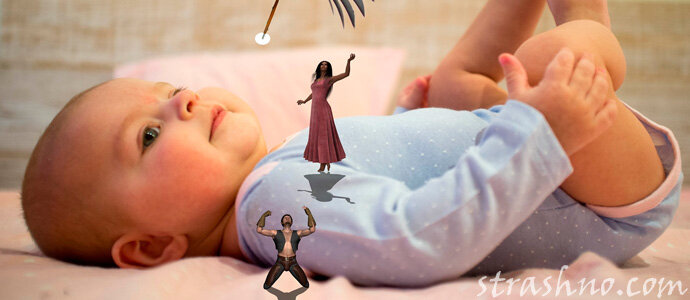 Маленькие дети смотрят в потолок в одну точку (а куда еще может смотреть такая кроха?). Но иногда складывается такое впечатление, что они смотрят на что-то определённое. Я не придавала этому значению, пока ребенку не исполнился год. Хотя стоит признаться, что я и раньше пару раз сама посматривала на потолок в ту точку, куда пристально смотрел ребёнок. Ничего там не было. Сейчас ребёнку почти полтора года, а он всё продолжает смотреть в потолок перед засыпанием. Вчера засыпаем с ребёнком, а он смотрит на потолок, указывает в какую-то точку пальчиком и громко говорит «тра-тт-та». У меня в этот момент аж мурашки по спине побежали от страха. Я быстро перевела взгляд туда, куда указал ребёнок. На потолке в углу было чёрное пятно, которое моментально растворилось. Пятно больше было похоже на чью-то тень. Я схватила ребёнка и выбежала из комнаты. Позвала мужа. Естественно, в комнате ничего не нашли. И ладно, если бы эта тень появилась благодаря уличному освещению, но у нас тканевые плотные ж