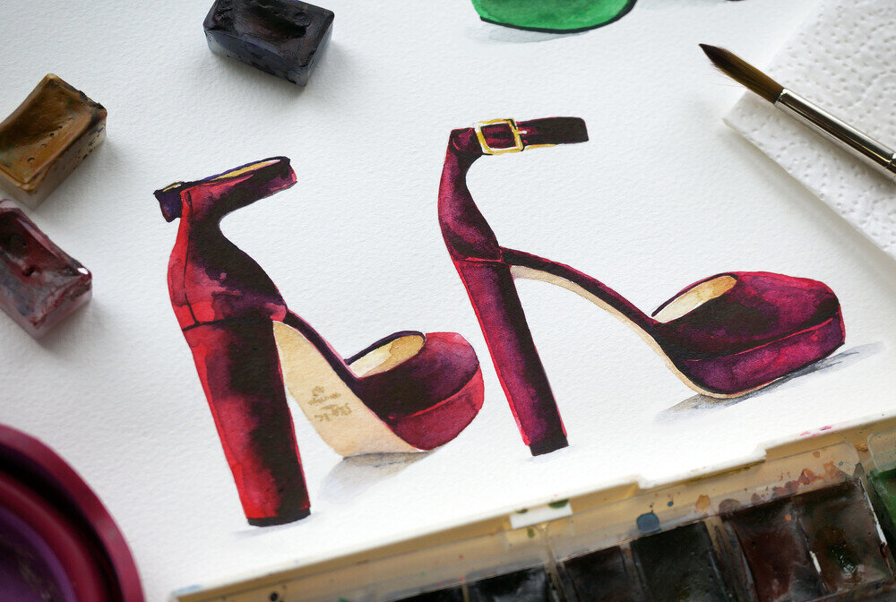 Художник Анна Михеева рассказывает и показывает, как рисовать бархатную обувь акварелью. Пошаговый матер-класс >>> Подготовка к работе Рисование акварелью, а особенно передача особенностей бархата, требует тренировки. Но зато какие эффектные получаются переходы цвета! Бархат можно нарисовать в один слой в технике «по-мокрому» — сразу вводя светлые и темные области. А можно сделать это и в два слоя: в таком случае гораздо проще контролировать растекание темных пятен, легко сберечь светлые области и не перетемнить. Это очень важно, ведь по сути бархат на рисунке — это контраст темного и светлого с добавлением фактурных особенностей. Я предлагаю потренироваться рисовать бархат «в два слоя»: сначала пройдемся светлым, а потом, когда он полностью высохнет, темным сверху — и там поработаем с фактурой при помощи бумажной салфетки. На рисунке карандашом я подробно останавливаться не буду. Если туфли покажутся вам сложными объектами, попробуйте начать с самых простых бархатных сумочек прямоугол