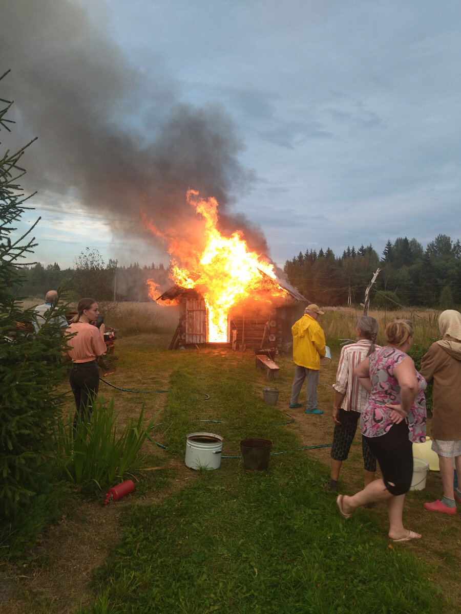 Иногда жизнь вносит в наши планы свои коррективы. Вчера у нас вот такие коррективы в планы на баню внесла. - Что произошло? - Позже спросила инспектор. - Я топила баню. Тут и ответить больше нечего. Видимо, искра попала на чердак, загорелась крыша. И очень быстро заполыхало всё. Но главное: все живы, здоровы, никто не пострадал. Отделались лёгким испугом. Страшно было, когда только увидели. Но долго паниковать возможности не было. Позвали всех, кто был рядом и мог помочь, включили насос, поливали траву и дрова у бани. Баню поливать уже было бесполезно. Очень хорошо, что несколько дней назад я скосила траву вокруг. Это действительно нужно делать, иначе бы мог быстро разойтись. И ещё очень повезло, что баня у нас стоит очень далеко от всех домов, почти в поле. Почувствовали, что вся деревня-большая семья. Даже если живём и друг друга в обычной жизни и не видим даже. Прибежали, носили воду из колодцев вокруг. И дети постарше подключились. Но для них это было и как развлечение.