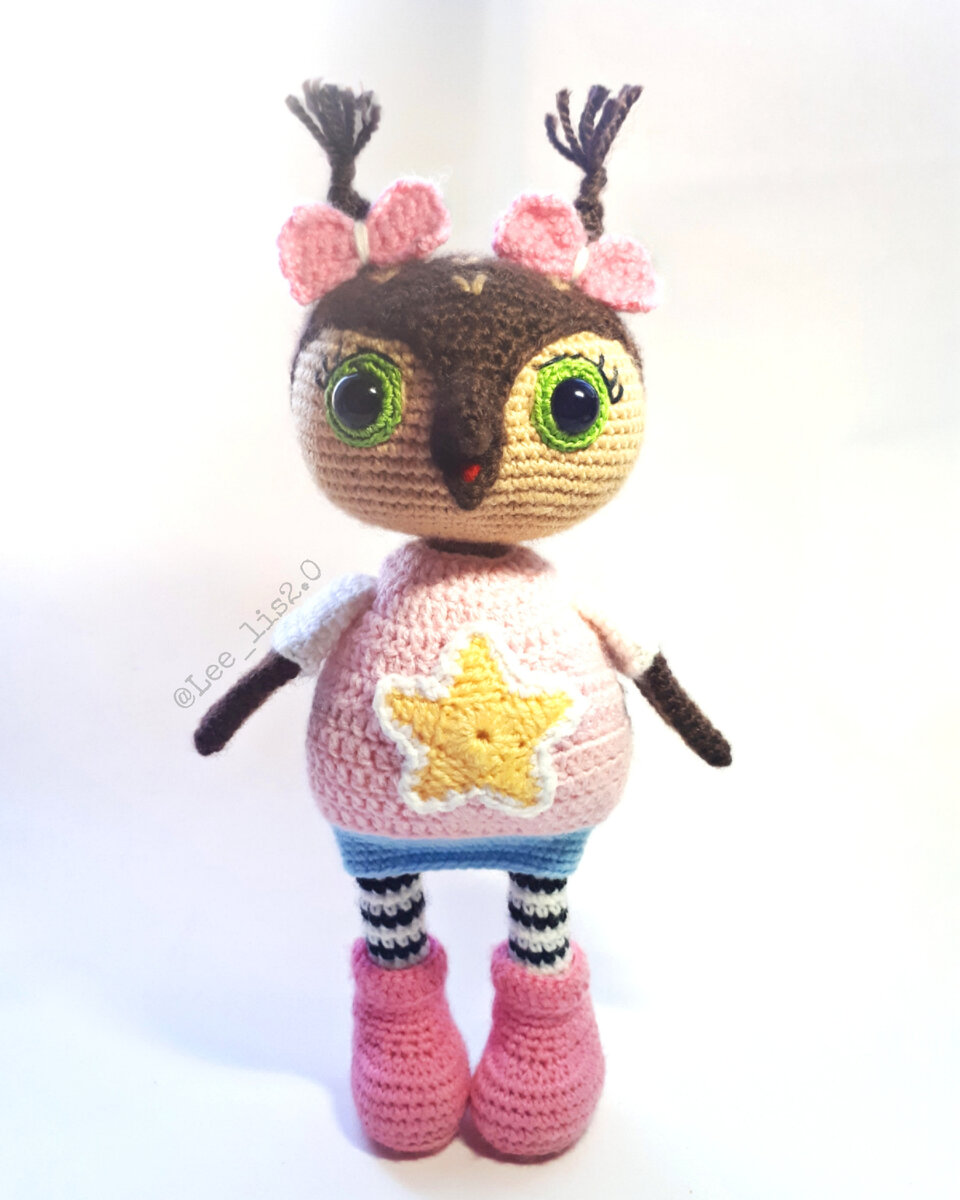 Всем привет! Это любовь с первого взгляда😍Спасибо большое за МК @tatyana_yurovskaya. Увидев совушку, решила обязательно свяжу! Рост красотки 24 см с ушками, и 26 см если считать кисточки на ушах. Голова поворотная, это мой первый опыт. Стоит не плохо, хоть и без каркаса. Глазок и ресниц как в МК у меня не было, поэтому пришлось импровизировать)) Заметьте у нее и язык есть😋 Всем хорошего дня!
