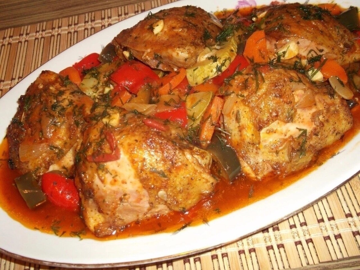 Нужно приготовить и вкусить, чтобы понять как это вкусно. Куриные бёдрышки освободить от косточки(так по рецепту), но я готовила на косточке. Посолить, поперчить, добавить сладкую, молотую паприку, раст. или оливковое масло и приправы, какие Вы любите. Замариновать и оставить не менее, чем на 30 минут. Обжарить бёдрышки на раст. масле на сковороде, желательно глубокой. Убрать бёдрышки на время в миску. На сковороду поочерёдно выкладываем: 2 головки репчатого лука, порезанного полукольцами или крупным кубиком. Обжариваем по 3 минуты каждый овощ. Затем морковь, (все овощи нарезать крупно) , помидоры 3 шт. средние, 1 -2 баклажана, 1 средний кабачок, 4 -5 зубков чеснока, болгарский перец 3 шт. Когда овощи обжарятся, добавить 1 ст. л. вкусной томатной пасты, соус чили по вкусу, воды столько, чтобы овощи полностью были в соусе. Пробуем на соль и доводим до вкуса. Можно также добавить сахар. Выкладываем курицу на овощи и тушим под крышкой на маленьком огне от 20 до 30 минут. Кто какие люб