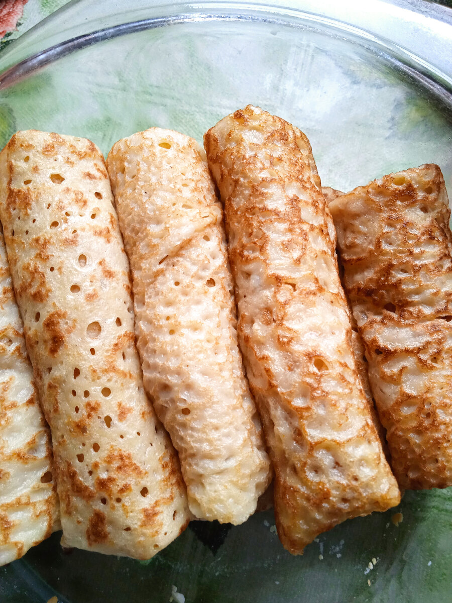 Тесто: Мука 0.7кг по 60р - 42р; Яйцо 2шт по 7р- 14р; Сахар 30г по 60р - 1.8р; Кефир 0.2л по 90р- 18р; Соль 3г по 15р - 0.05р. Вода 0р; Масло растительное 100мл по 150р- 15р Начинка: Масло сливочное 30г по 550р - 16р.50коп. Лук репчатый 100г по 35р - 3р.50коп; Яйцо 3шт - 21р; Рис 100г по 80р- 8р. Приготовить блины. Для начинки лук мелко нарезать, затем пассеровать его в сливочном масле, затем добавить мелко нарезанные отварные яйца, отваренный рис, посолить по вкусу. Должно получиться примерно 20блинчиков, тогда выходит по 6р.99коп. за 1шт. Насчёт калорийности: У меня сковорода маленькая, поэтому блинчики маленькие, тонкие, начинку кладу тоже чуть-чуть. И 100г выходит около 300кКал. Кто-то, кому повезло, печет блины на старых надёжных чугунных сковородах, или любит плотную консистенцию, и начинку не жалеет, у того один блин может получиться и 150г, и 170 с начинкой. А это уже под 500 кКал! Приятного аппетита!