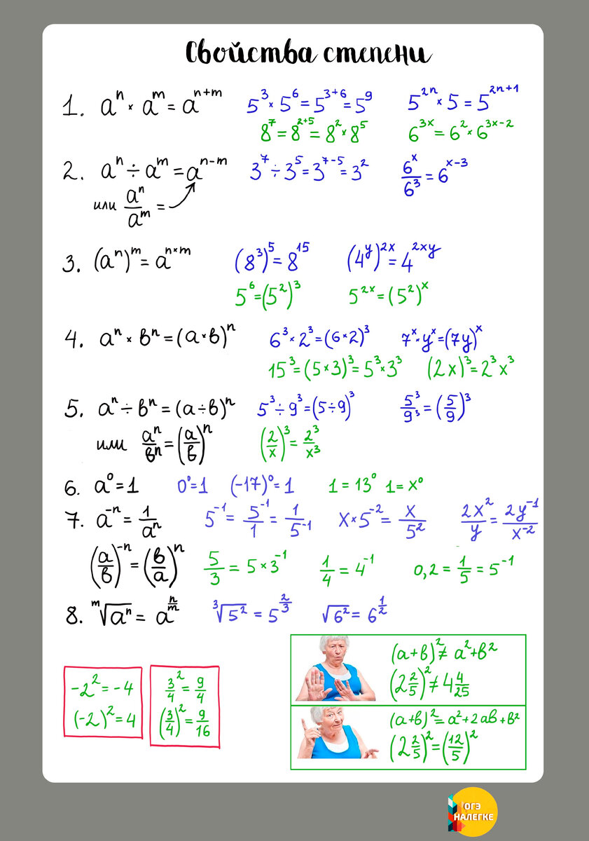 ΠΎΡΡ ΡΡΠΎ-ΡΠΎ Π±ΡΠ»ΠΎ ΠΎΠ΄ΠΈΠ½Π°ΠΊΠΎΠ²ΠΎΠ΅, Π»ΠΈΠ±ΠΎ ΠΎΡΠ½ΠΎΠ²Π°Π½ΠΈΠ΅ ΡΡΠ΅ΠΏΠ΅Π½ΠΈ, Π»ΠΈΠ±ΠΎ ΠΏΠΎΠΊΠ°Π·Π°ΡΠ΅Π»Ρ, Π½Π΅Π»ΡΠ·Ρ ΠΏΡΠΈΠΌΠ΅Π½ΠΈΡΡ ΡΠ²ΠΎΠΉΡΡΠ²ΠΎ Π΄Π»Ρ ΡΠ»ΡΡΠ°Ρ, ΠΊΠΎΠ³Π΄Π° Π²ΡΡ Ρ Π½Π°Ρ ΡΠ°Π·Π½ΠΎΠ΅. ΠΡΠΎΡΠΎΠ΅: Π½Π΅Ρ Π½ΠΈ ΠΎΠ΄Π½ΠΎΠ³ΠΎ ΠΏΡΠ°Π²ΠΈΠ»Π° Π΄Π»Ρ ΠΏΠ»ΡΡ ΠΈΠ»ΠΈ ΠΌΠΈΠ½ΡΡ, ΡΠΎΠ»ΡΠΊΠΎ ΡΠΌΠ½ΠΎΠΆΠ΅Π½ΠΈΠ΅ ΠΈΠ»ΠΈ Π΄Π΅Π»Π΅Π½ΠΈΠ΅, Π° ΡΡΠΎ Π΄Π΅Π»Π°ΡΡ, ΠΊΠΎΠ³Π΄Π° Π² ΠΊΠ²Π°Π΄ΡΠ°Ρ Π²ΠΎΠ·Π²ΠΎΠ΄ΠΈΡΡΡ ΡΡΠΌΠΌΠ°? ΠΡΠ²Π΅ΡΠ°Ρ, Π±Π°Π±ΡΠ»Π΅ΡΠΊΠ° Π² ΡΠΈΠ½Π΅ΠΌ ΡΠ²ΠΈΡΠ΅ΡΠ΅ Π½Π° ΠΌΠΎΠ΅ΠΉ ΡΠΏΠ°ΡΠ³Π°Π»ΠΊΠ΅ Π²Π°ΠΌ ΠΏΠΎΠ΄ΡΠΊΠ°ΠΆΠ΅Ρ. Π Π½Π°ΠΏΠΎΡΠ»Π΅Π΄ΠΎΠΊ, Π΄Π΅ΡΠΆΠΈΡΠ΅ Π² Π³ΠΎΠ»ΠΎΠ²Π΅ ΠΌΡΡΠ»Ρ, ΡΡΠΎ Π²ΡΠ΅ ΠΏΡΠ°Π²ΠΈΠ»Π° ΠΏΡΠΈΠΌΠ΅Π½ΠΈΠΌΡ ΠΊΠ°ΠΊ Π² ΠΎΠ΄Π½Ρ, ΡΠ°ΠΊ ΠΈ Π² Π΄ΡΡΠ³ΡΡ ΡΡΠΎΡΠΎΠ½Ρ, Π½Π°ΠΏΡΠΈΠΌΠ΅Ρ Π΅ΡΠ»ΠΈ Π Π² ΡΡΠ΅ΠΏΠ΅Π½ΠΈ Π½ΠΎΠ»Ρ ΡΠ°Π²Π½