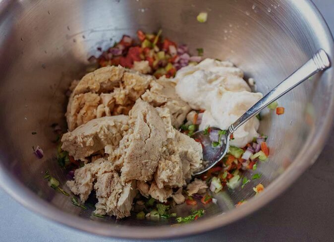 Чаще всего, такие рецепты передаются в кулинарных книжках хозяек многих поколений, потому что они легки в приготовлении и удивительны на вкус. И этот один из них. Утро тысячи французов начинается именно с этой намазки, которую они используют в качестве добавки к утреннему омлету или начинки для свежеиспечённого круассана. Необходимые ингредиенты: Дополнительно на выбор: Приготовление: Необходимо достать из банки тунец и избавится от лишней жидкости. Мелко порубить сельдерей, красный и зелёный лук. Далее перемешать все ингредиенты в одной миске и всё. Готово. Остаётся только разрезать круассан пополам, положить него лист свежего салата и уже готовую начинку. А ещё, можно добавить хрустскости в виде пары слайсов болгарского перца или свежего огурца. Особым вкусом будет отличаться такой завтрак со свежесваренным «яйцо-пашотом». По-настоящему сытно и полезно. А самое приятное, что такого объёма начинки с лихвой хватит на несколько завтраков. И её вкус совершенно не потеряет своей изыска