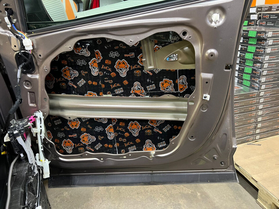 Для начала нам нужно получить доступ к технологическому отверстию, что не представляет особого труда. Снимаем дверные карты, под которыми находится штатная защита на которую крепится стеклоподъемник, ручка и все остальные важные элементы, т.е. все сразу в сборе, что очень удобно. Держится защита на болтах. Далее, когда мы получили доступ к тех.отверстию приступаем к нанесению материалов. Первым слоем был проклеен Black Jack 2.7мм. — вибропоглощабщий материал. К его преимуществу стоит отнести меньший вес, в сравнении с другими материалами, такими как, к примеру, четырехмиллиметровым М4, следовательно двери не будут после сборки сильно утяжеляться. Затем вторым слоем проклеивался Комфорт 10 — это уже звукоизоляционный материал. Ну и завершающая часть работы с дверьми — это Герметон А15. Он наносится непосредственно на дверную карту. Стоит отметить что на дверной карте с завода присутствовал материал, но назвать его шумоизоляцией довольно трудно, он больше защитит от попадания пыли, нежели от шума.