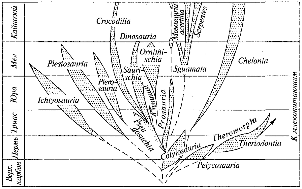 В начале триасового периода, Земля восстанавливалась после великого Пермского вымирания. В это время вымирали многие животные, но появлялись новые виды, среди них архозавры. Архозавры были предками динозавров , птерозавров и современных крокодилов и птиц. Архозавры это диопсиды, рептилии. Они появились примерно 300 000 000 лет назад , некоторые из их потомков сохранились и до наших дней. Динозавры, появившиеся примерно 225 000 000 лет назад и вымершие 65 000 000 лет назад являются прямыми потомками архозавров. Первый кандидат предка динозавров Эупаркерия. Эупаркерия была представлена в телевизионном сериале BBC «Прогулки с монстрами», как предок всех динозавров. Данное утверждение некорректно: в действительности, эупаркерия не является прямым предком динозавров, однако она очень близка к динозавроморфам, а эта группа ближе к птерозаврам, которые не является динозаврами. Вторые кандидаты эффигия и попозавр. Но эти две рептилии ближе были к крокодилам, пусть они и ходили на двух ногах