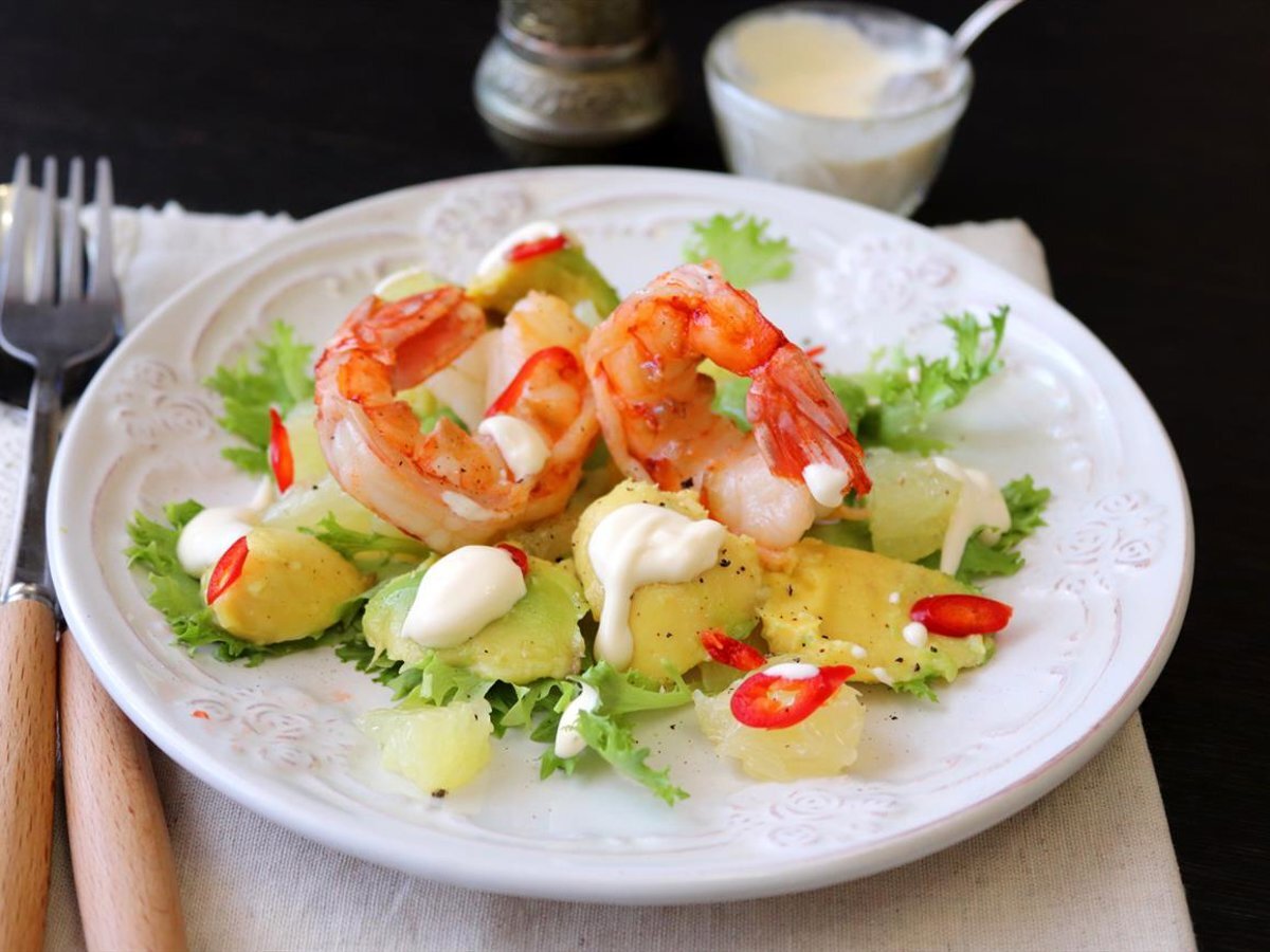 Очень вкусный, лёгкий и свежий салатик с креветками! Подойдёт для романтического вечера, для женской компании и для праздничного вкусного ужина. Рецепт позаимствовала из книги "Про праздники" И. Мосоловой. Ккал: 204.32, время приготовления: 20 мин., порций: 1 #Салаты и закуски #Американская #На ужин #Праздничное блюдо #Морепродукты Ингредиенты Приготовление: 1. Подготовить ингредиенты для салата. Фрукты и зелень сполоснуть, обсушить. Креветки разморозить. На одну порцию я взяла половину грейпфрута, маленький авокадо и две королевские креветки. 2. Авокадо разрезать пополам, удалить косточку. Чайной ложкой выбрать мякоть. Можно нарезать крупными кубиками или слайсами. 3. Грейпфрут разделать на филе. Каждую дольку разрезать на три части. Сок собрать. 4. Креветки почистить, удалить кишечник(темную ниточку вдоль хвостика). У меня крупные королевские креветки, но можно взять небольшие. 5. На сковороде разогреть ложку растительного масла, положить креветки и влить коньяк. Обжарить кревет