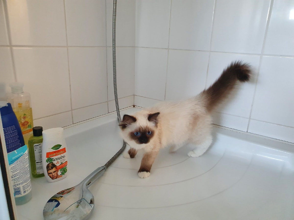 Первая встреча кошки с собакой была наделю назад. Теперь каждый день мы выпускаем кошку погулять по дому. Обычно во время завтрака она спускается с нами на первый этаж. А это собачьи владения... точнее были такими :) Кошке очень нравится посещать ванную. Она там все изучает :) Так же у кошки появилось любимое место. Это небольшое пространство между стенкой и шкафом. Раньше я там хранила коврики для йоги. А теперь там спит кошка С собакой дружба постепенно налаживается. Точнее собака постепенно успокаивается и не так бурно реагирует на кошку. На данный момент они могут лежать в присутствии друг друга примерно 5 минут. Потом или кошка, пытается уйти и собака летит за ней. Или у собаки сдают нервы и она бежит к кошке лизаться. В таких забегах есть не только минус, но и плюс :) Собака начала бегать по лестнице сама, а не кататься на руках «человеков» Кошка на первом этаже уже освоилась и даже немного обнаглела — пьет из собачьей миски :) А собака стоит рядом и терпит такое нахальство.