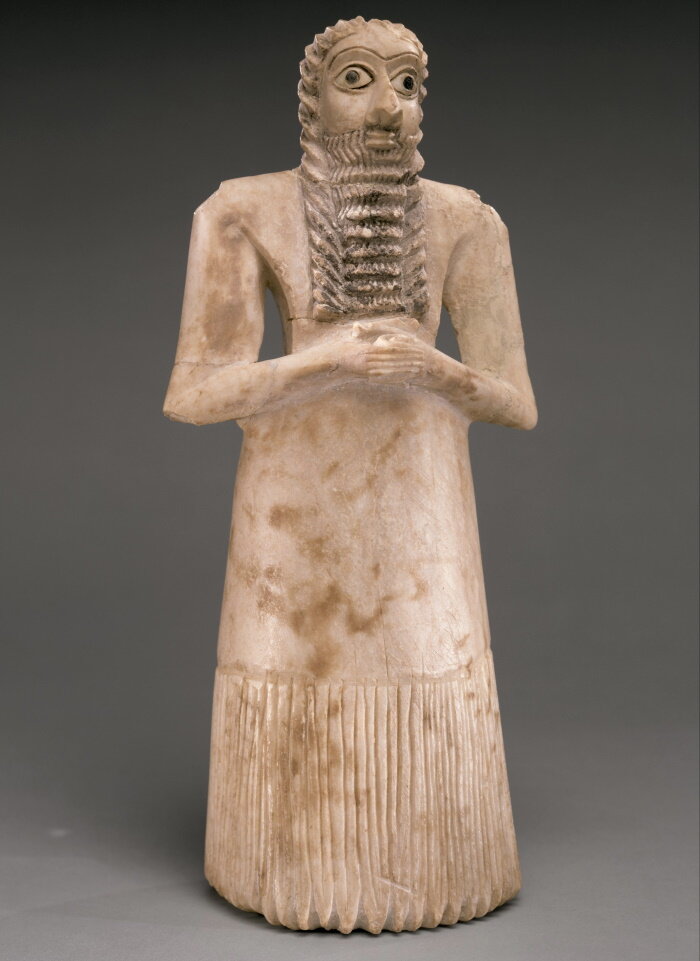Эта стоящая фигура со сложенными руками и широко раскрытыми глазами - поклоняющийся. Он был помещен в храм в городе Эшнунна (современное название Телль-Асмар), возможно, посвященный богу Абу, чтобы постоянно молиться от имени человека, которого он представлял. Ибо люди в равной степени считались физически присутствующими в своих статуях. На подобные статуи иногда наносили имена правителей и членов их семей.