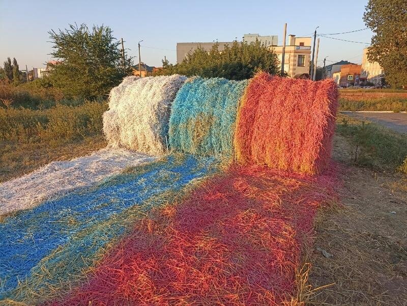В центре Сызрани появился необычный арт-объект: такого в нашем городе еще не было. На улице Кирова, 30, на площадке перед зданием комитета по строительству и архитектуре, были установлены три больших рулона из соломы - но не простых, а окрашенных в цвета российского триколора. Специальная машина, называемая пресс-подборщик, собирает в полях высушенную солому, после того как комбайн смолотит там хлеб, и прессует цилиндры, которые могут по весу доходить до 260-320 кг. Три цилиндра соломы как бы раскручиваются по земле, оставляя после себя полосы красного, белого и голубого цвета, российского флага. Нужно отметить, что установка цилиндров-триколоров именно в этом году выглядит символично. Завтра, 22 августа, в стране будет отмечаться День российского флага: праздник посвящён возрождённому флагу Российской Федерации — «национальному триколору». В 2022 году, когда из-за внешнеполитичеких потрясений снизилось поступление товаров и продуктов в нашу страну, особое внимание уделено сельскому хо