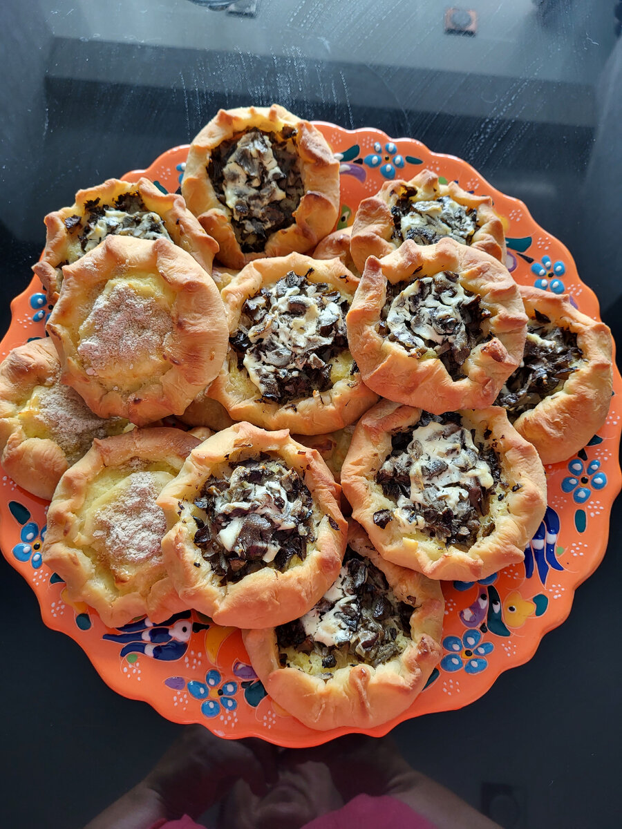 Наступили выходные, и я, конечно, не могла не порадовать своих родных рогульками. Это действительно одни из лучших пирогов, которые мы все очень любим. Я год назад делилась уже рецептом, но может кто потерял, ловите! 250 г кефира (комнатной температуры) или сметаны, 1 яйцо 1 чайная ложка (с горкой) соли 1 столовая ложка сахара мука (я на взгляд беру, не взвешиваю), сколько возьмет, примерно 300-400 г. 100 г растительного масла (без запаха) Замешиваем тесто, оно не должно быть крутым, должно получиться слегка упругим, но в то же время и мягким. На один час убираем в холодильник, а сами занимаемся начинками. Я всегда делаю 2 или 3 порции сразу. Из начинок - 1) картофельное пюре; 2) первый тонкий слой картофельного пюре, а сверху слой соленых грибов. И, конечно же, смазываем сметаной. В духовку на средний уровень, температура 180-200 градусов 30-35-40 минут (в зависимости от духовки). Как испекутся, смазываю маслом сливочным. Такое объеденье! Попробуйте испечь и порадовать своих близки