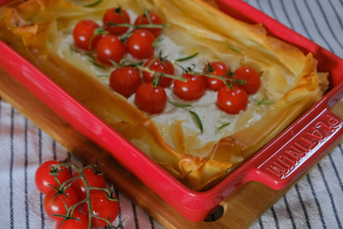 Пироги - это всегда вкусно! Делается довольно быстро. Главное заранее достать тесто фило из морозилки, потому что оно чаще всего продаётся замороженным и ему нужно время чтобы оттаять. Ингредиенты: Приготовление: 1. Растопить сливочное масло на медленном огне. 2. Смешать творог с фетой. Посолить при необходимости и поперчите. 3. Смазать форму маслом 4. Тесто фило надо раскрутить. Положить 1 лист теста в форму и смажьте маслом. 5. Сверху положите второй лист теста фило и тоже смажьте. 6. Проделайте эту процедуру со всем тестом. Сверху выложите начинку. 7. Загнуть края внутрь, смазать маслом. Воткните томаты черри. 8. Выпекать в предварительно разогретой духовке до 180 градусов на режиме вверх-низ 10-25 минут. Затем достаньте из духовки и полейте мёдом. Подавать можно как в горячем, так и холодном виде. Приятного аппетита! #еда #РЕЦЕПТЫ #ПИРОГ #ТЕСТОФИЛО #ВЫПЕЧКА